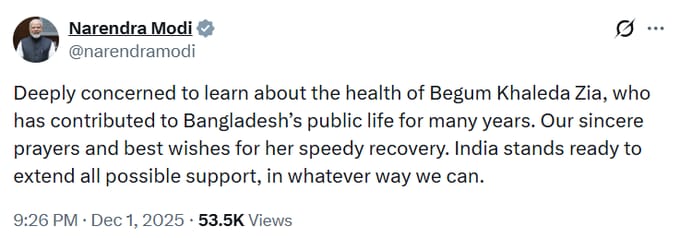 प्रधानमंत्री नरेन्द्र मोदी ने बांग्लादेश की पूर्व प्रधानमंत्री बेगम खालिदा ज़िया के शीघ्र स्वस्थ होने की कामना की है। सोशल मीडिया पोस्ट में, श्री मोदी ने कहा कि बांग्लादेश की पूर्व प्रधानमंत्री ने कई वर्षों तक देश के सार्वजनिक जीवन में योगदान दिया है। प्रधानमंत्री मोदी ने कहा कि भारत हर संभव सहायता प्रदान करने के लिए तैयार है।