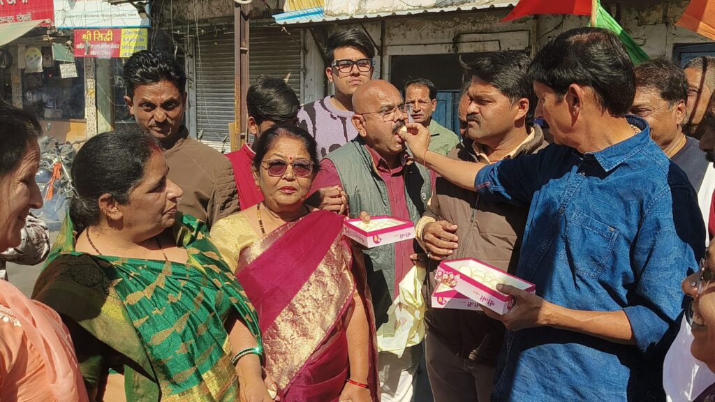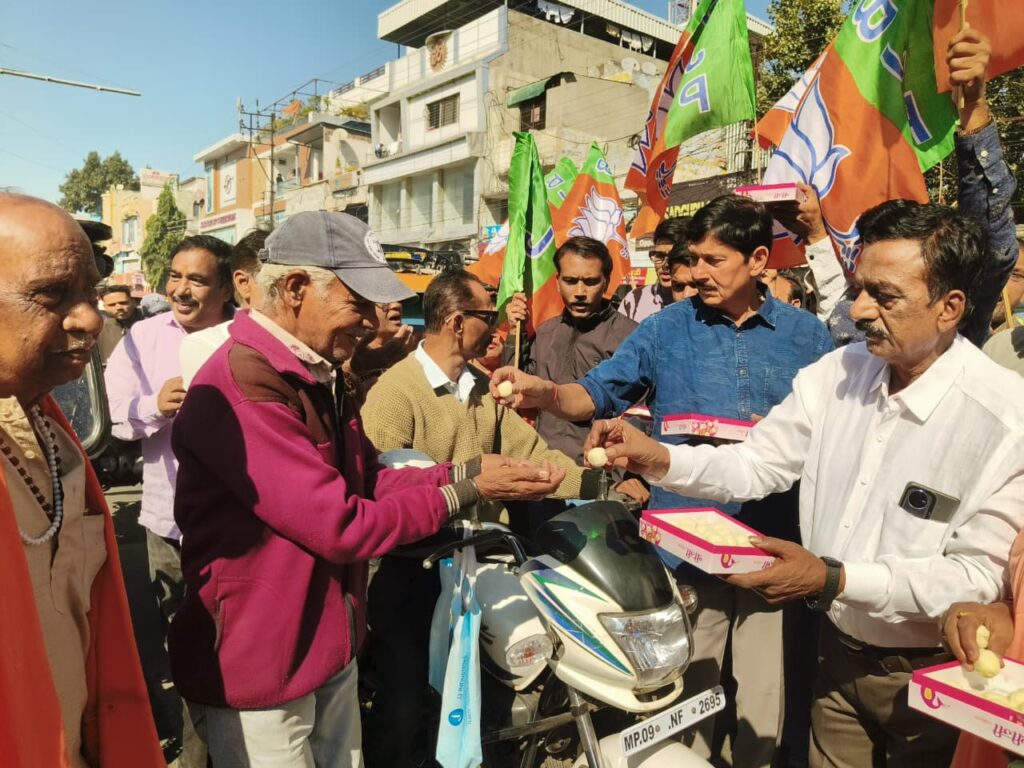 मोहन सरकार के 2 वर्ष पूर्ण, विधानसभा क्षेत्र क्रमांक 2 में विधायक रमेश मेंदोला ने पाटनीपुरा चौराहे पर मिठाई बांटकर मनाया उत्सव