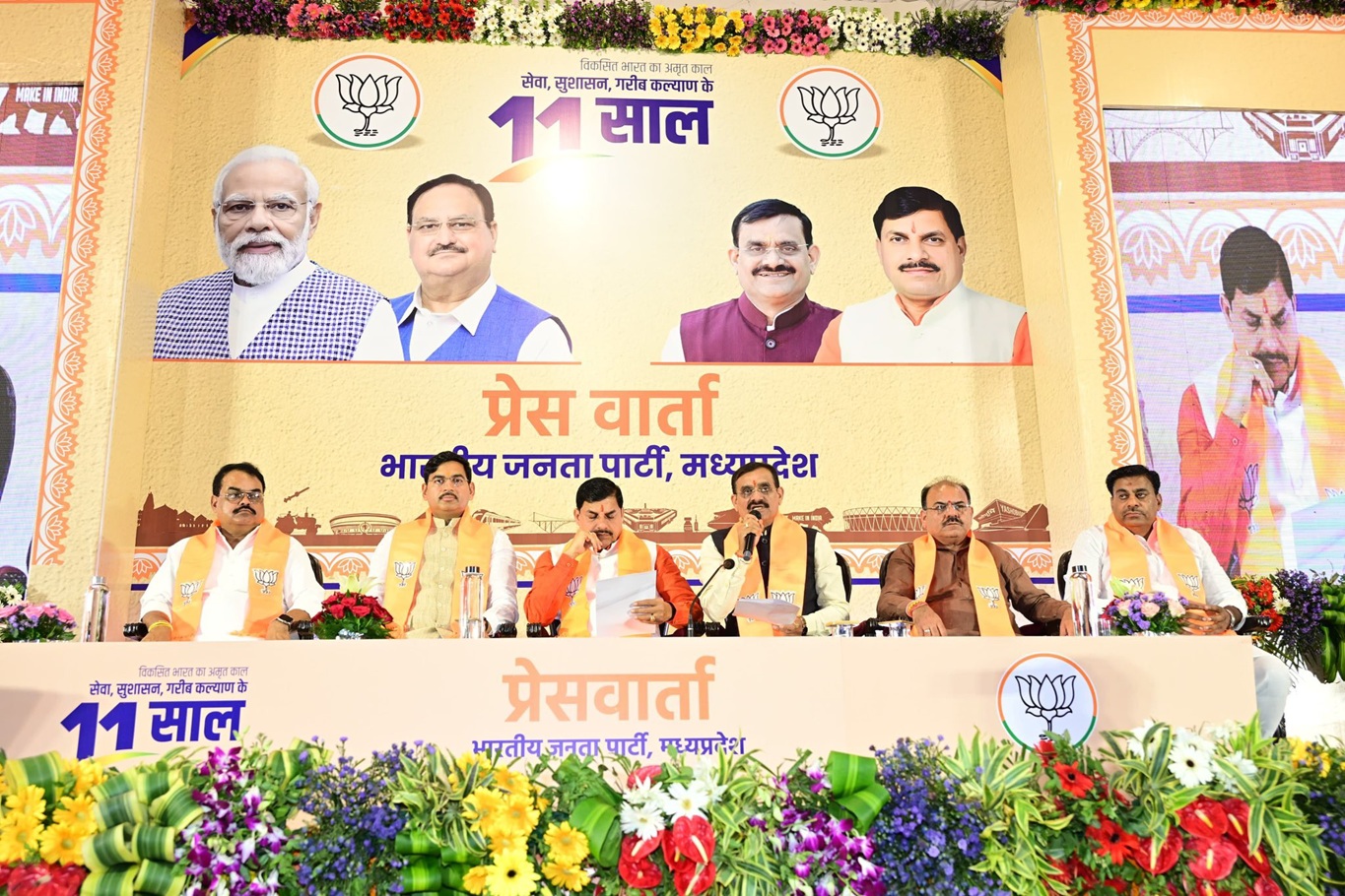 भोपाल, 10 जून (हि.स.)। प्रधानमंत्री नरेन्द्र मोदी के यशस्वी नेतृत्व के विगत 11 वर्ष नए भारत के दृष्टिकोण से सशक्त, समृद्ध और आत्मनिर्भर यात्रा के प्रतिमान हैं। इन दिनों में सेवा, सुशासन और गरीब कल्याण के कीर्तिमान ने जन-जन के जीवन में खुशहाली का नया अध्याय लिखा है। हमारा भारत विश्व की चौथी सबसे बड़ी आर्थिक महाशक्ति के रूप में स्थापित हुआ है। वर्ष 1947 में देश की अर्थव्यवस्था विश्व में 15वें स्थान पर थी। वहीं अर्थशास्त्री डॉ. मनमोहन सिंह के कार्यकाल में 11वें स्थान पर रही, किंतु मोदीजी ने चहुंओर दिशाओं में कार्य करते हुए आज देश की अर्थव्यवस्था को बहुत ऊंचाइयों पर पहुंचा दिया है। उनका कार्यकाल बिना किसी के साथ भेदभाव किए, तुष्टीकरण से मुक्त विकसित भारत का अमृत काल है, जिसमें सेवा, सुशासन, गरीब कल्याण के अब तक के 11 साल पूर्ण हुए हैं। उक्त बातें भोपाल स्थित भाजपा प्रदेश कार्यालय में मंगलवार को पत्रकारों से बातचीत में मुख्यमंत्री डॉ. मोहन यादव ने कहीं।