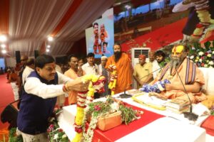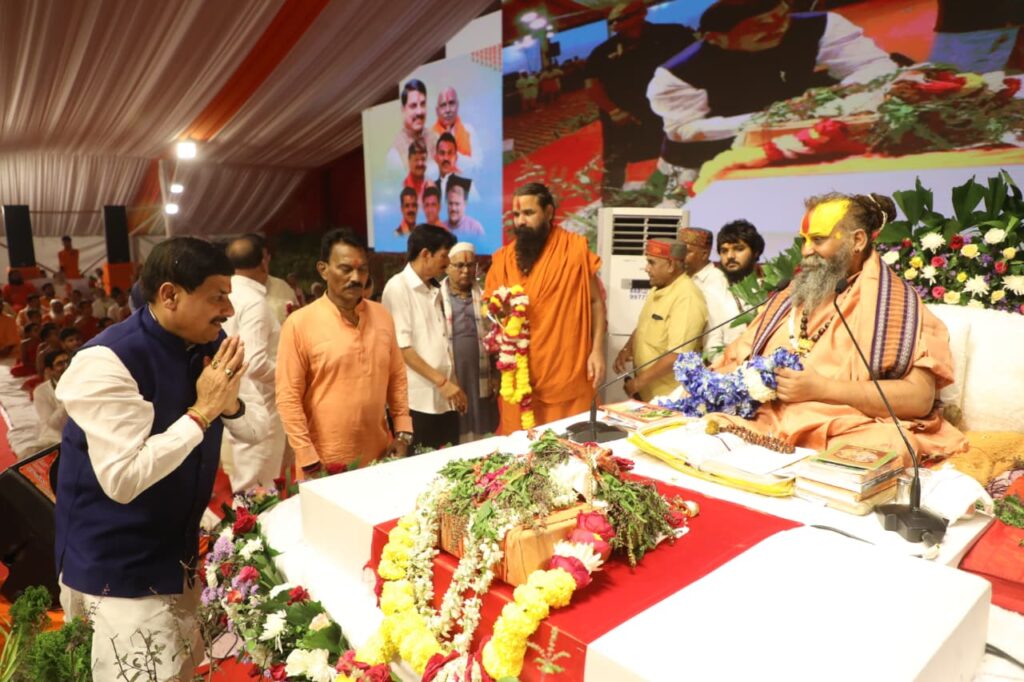 मुख्यमंत्री के पहुंचने पर विधायक रमेश मेंदोला ने पुष्पमाला पहनाकर उनका स्वागत किया। इस अवसर पर श्रीमद् जगद्गुरु द्वाराचार्य अग्रपीठाधीश्वर – मलुकपीठाधीश्वर स्वामी श्री राजेंद्रदास देवाचार्य महाराज ने अपने आशीर्वचन में कहा —