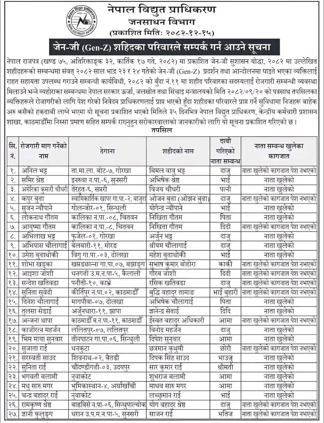 सरकार ने तुरंत कदम उठाते हुए सभी परिजनों को नेपाल विद्युत प्राधिकरण (Nepal Electricity Authority) में नौकरी देने का प्रस्ताव भेजा। नौकरी की नियुक्ति उनके गृह जिले में, उनकी शैक्षणिक योग्यता और क्षमता के आधार पर की जाएगी।