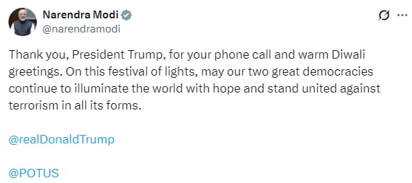 प्रधानमंत्री नरेन्द्र मोदी ने दिवाली की हार्दिक शुभकामनाओं के लिये अमरीका के राष्ट्रपति डॉनल्ड ट्रंप को धन्यवाद दिया है। प्रधानमंत्री मोदी ने सोशल मीडिया पोस्ट में भारत और अमरीका की मजबूत साझेदारी की सराहना की। उन्होंने कहा कि ये दो महान लोकतंत्र पूरे विश्व को आशा की किरण से आलोकित करते रहेंगे और हर प्रकार के आतंकवाद से निपटने के लिए एकजुट रहेंगे।