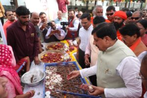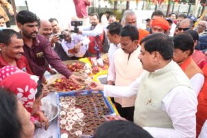 मुख्यमंत्री डॉ. यादव ने इंदौर में कलेक्टर श्री शिवम वर्मा के निर्देशन में चल रहे इस प्रकल्प की सराहना की। उल्लेखनीय है कि गाय के गोबर से बने स्वदेशी दीयों को दीपावली पर्व पर इंदौरवासियों का व्यापक समर्थन मिला। इस पहल के अंतर्गत लगभग दो लाख दीयों का विक्रय किया गया, जिससे स्थानीय स्वावलंबन को प्रोत्साहन मिला है। इस अवसर पर उन्होंने संबंधित टीम की सराहना करते हुए कहा कि ऐसी पहलें “स्वदेशी से समृद्धि” के विचार को जन-जन तक पहुंचाने में अहम भूमिका निभाती हैं।