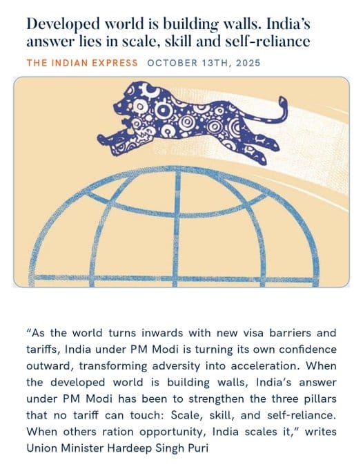 प्रधानमंत्री मोदी ने केंद्रीय पेट्रोलियम और प्राकृतिक गैस मंत्री हरदीप सिंह पुरी के एक लेख को साझा करते हुए सोशल मीडिया पोस्ट में कहा कि यह लेख दर्शाता है कि भारत कैसे कौशल और आत्मनिर्भरता के माध्यम से एक अलग रास्ता बना रहा है, जबकि विकसित देश केवल अपने हितों के बारे में सोच रहे हैं।