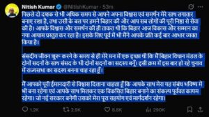 उन्होंने यह भी आश्वासन दिया कि आने वाले समय में भी उनका बिहार के लोगों से संबंध बना रहेगा और वे राज्य के विकास के लिए काम करते रहेंगे। साथ ही उन्होंने नई सरकार को पूरा समर्थन और मार्गदर्शन देने का भरोसा दिया।