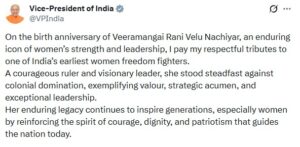 उपराष्ट्रपति सी. पी. राधाकृष्णन ने वीरामंगई रानी वेलू नाचियार की जयंती पर दी श्रद्धांजलि