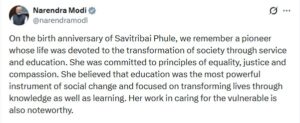 प्रधानमंत्री मोदी ने सावित्रीबाई फुले की जयंती पर अर्पित की श्रद्धांजलि
