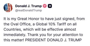 ट्रंप ने 10% वैश्विक टैरिफ पर कार्यकारी आदेश पर किए हस्ताक्षर, तुरंत लागू होगा