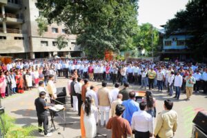 स्वाधीनता संग्राम के मूल मंत्र एवं राष्ट्रगीत वंदे मातरम की 150वीं वर्षगांठ के अवसर पर आज इंदौर नगर निगम मुख्यालय में सामूहिक वंदे मातरम गान का आयोजन किया गया। कार्यक्रम में महापौर पुष्यमित्र भार्गव और आयुक्त दिलीप कुमार यादव की उपस्थिति में निगम परिवार के अधिकारियों और कर्मचारियों ने राष्ट्रगीत का सामूहिक गायन कर देशभक्ति और गर्व की भावना व्यक्त की।