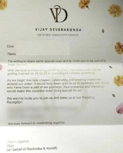 वायरल हो रहे निमंत्रण के अनुसार, विजय और रश्मिका 26 फरवरी को एक छोटे और निजी समारोह में सात फेरे लेंगे। शादी पारिवारिक सदस्यों और करीबी मित्रों की मौजूदगी में संपन्न होगी।